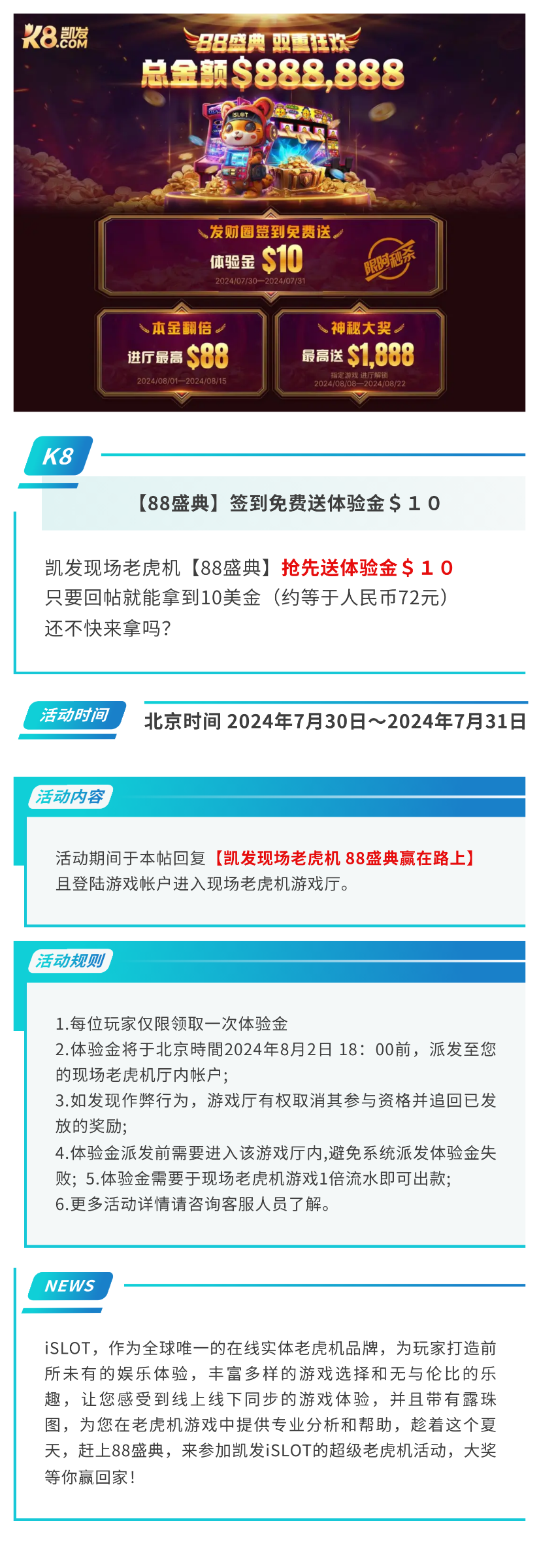 欢迎大家参加凯发【88盛典】双重狂欢活动!做为全球唯一的在线实体老虎机品牌,我们为您准备了丰厚的奖池,总金额高达$888,888,只为让您在这个夏天尽情享受游戏的乐趣。每日登录即可翻倍领取本金,更有机会赢取神秘大奖。立即加入我们,共享这场专属于玩家的豪华盛宴!